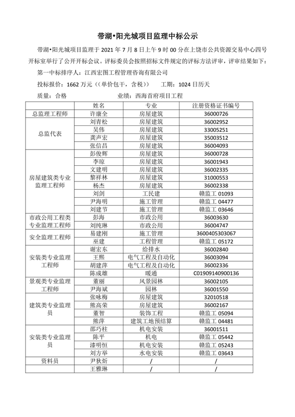 帶湖陽光城項目監(jiān)理中標(biāo)公示