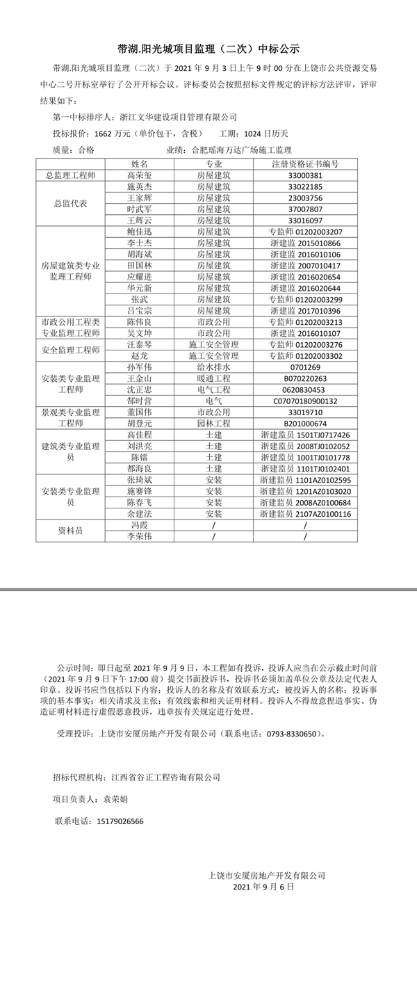 帶湖.陽光城項目監(jiān)理(二次)中標(biāo)公示